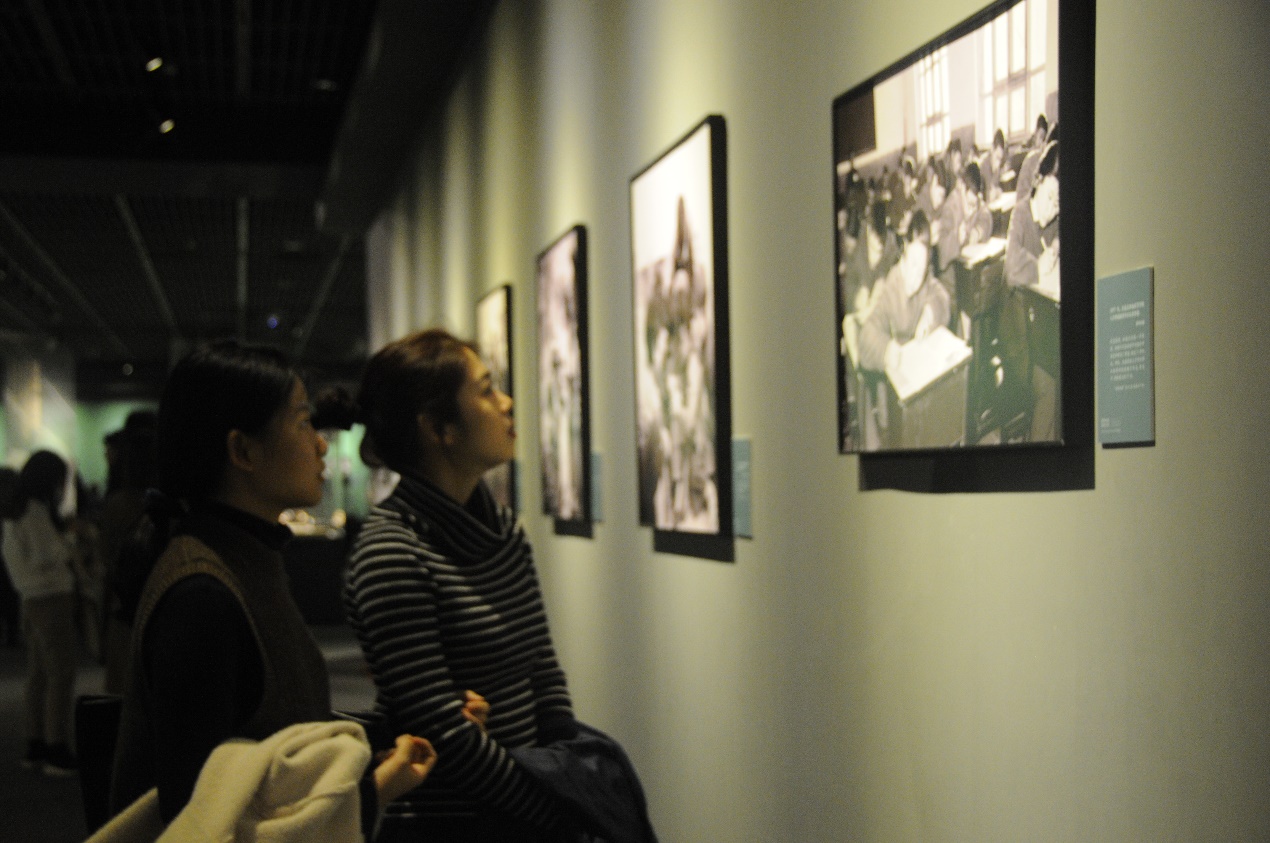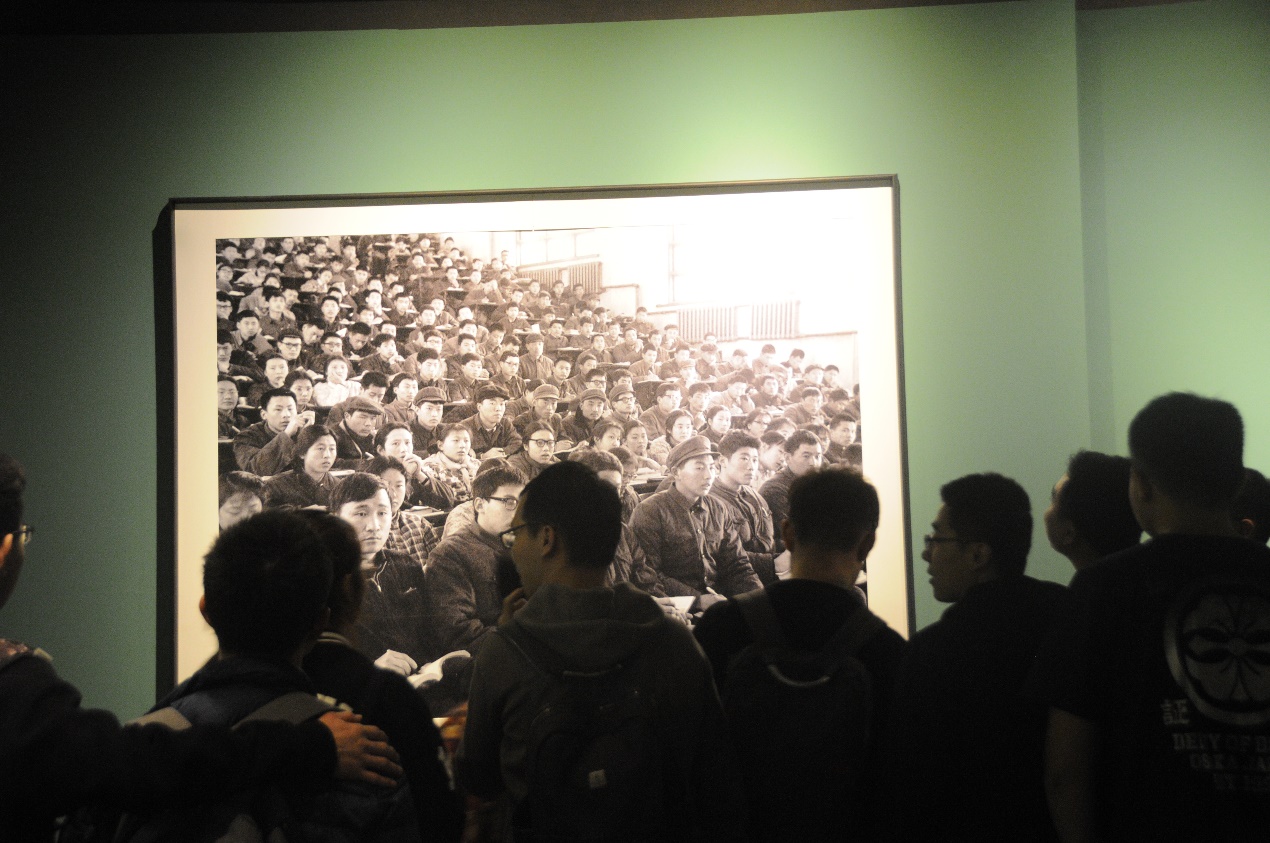 图为同学们参观1977年恢复高考后考试场景的珍贵影像