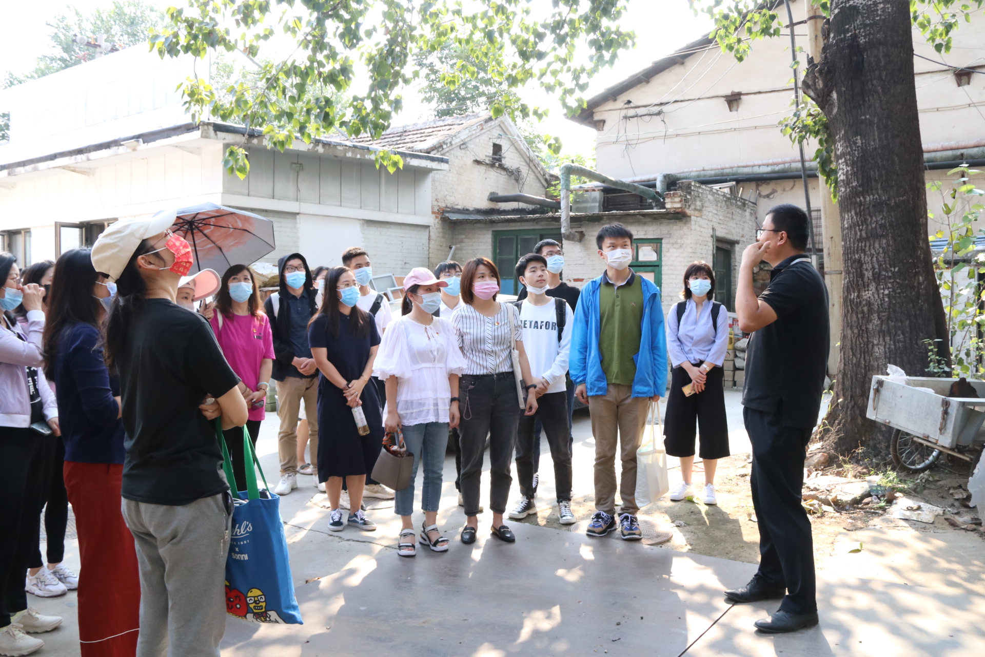 图为师生在二七厂原址听工作人员讲解发展历史