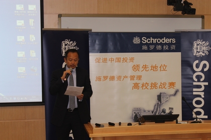 4月13日上午,施罗德投资案例大赛决赛在五道口金融学院4号楼阶梯教室圆满举行,施罗德投资管理(香港)有限公司中国业务总监郭炜、大中华区人力资源部主管黄颖贤、交银施罗德基金管理有限公司人力资源部总经理陈廷超、量化投资部总经理龙向东等作为决赛评委嘉宾出席。经过前期选拔,共有五位同学晋级决赛,比赛全程以英文进行,由2012级硕士生董孜孜主持。
