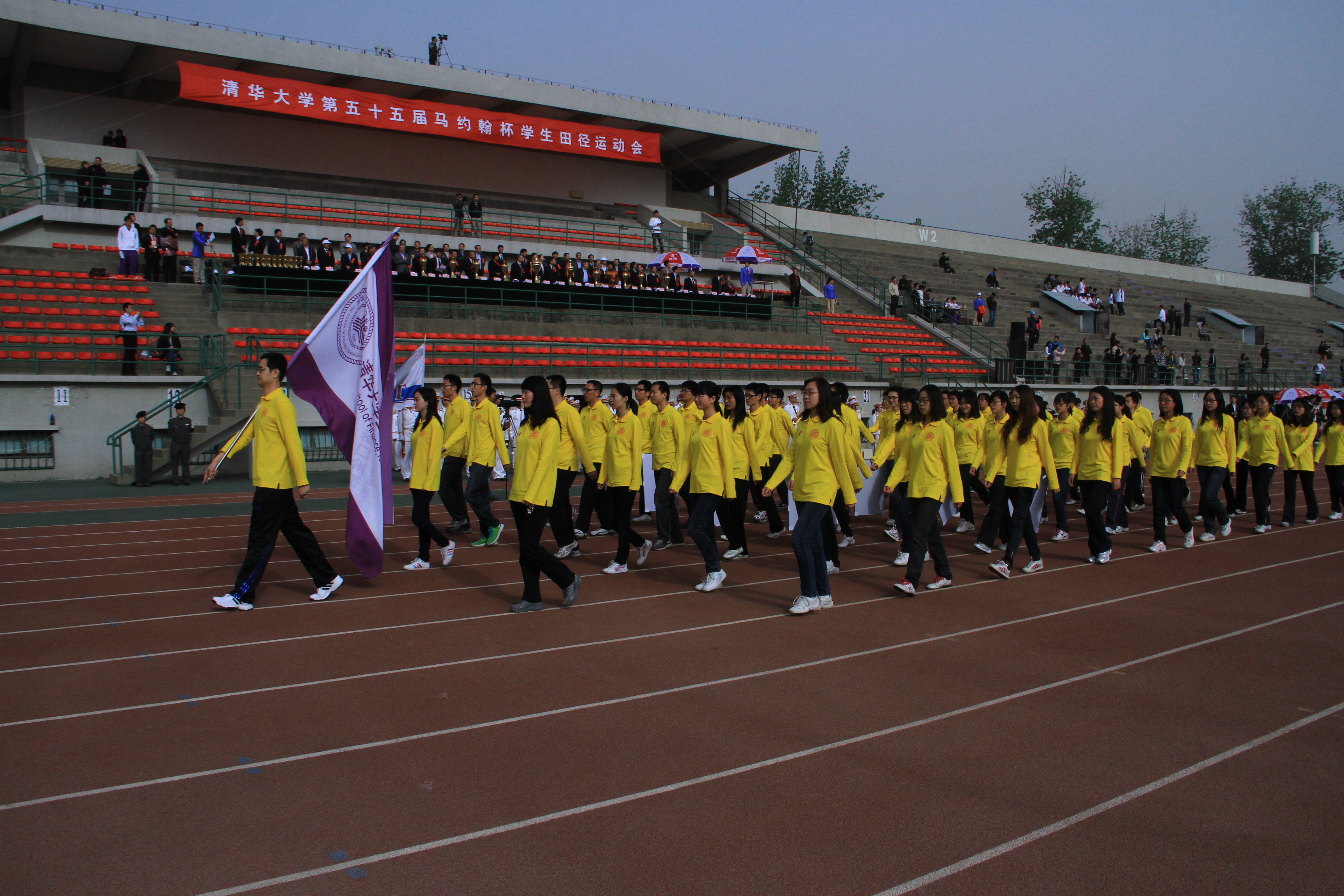 同学们经过了数次训练,身着整齐的明黄色服装,斗志昂扬,迈着整齐的步伐进入会场。经过主席台之时,通过“新百年,我们来了”,向历经百年沧桑的清华宣示着我们这个一个团结奉献的集体的到来。而嘹亮的口号声:道口奋进,清华加油,喊出了全院师生的心声:全体道口师生定会继承道口精神,发扬清华传统,续写道口辉煌。
