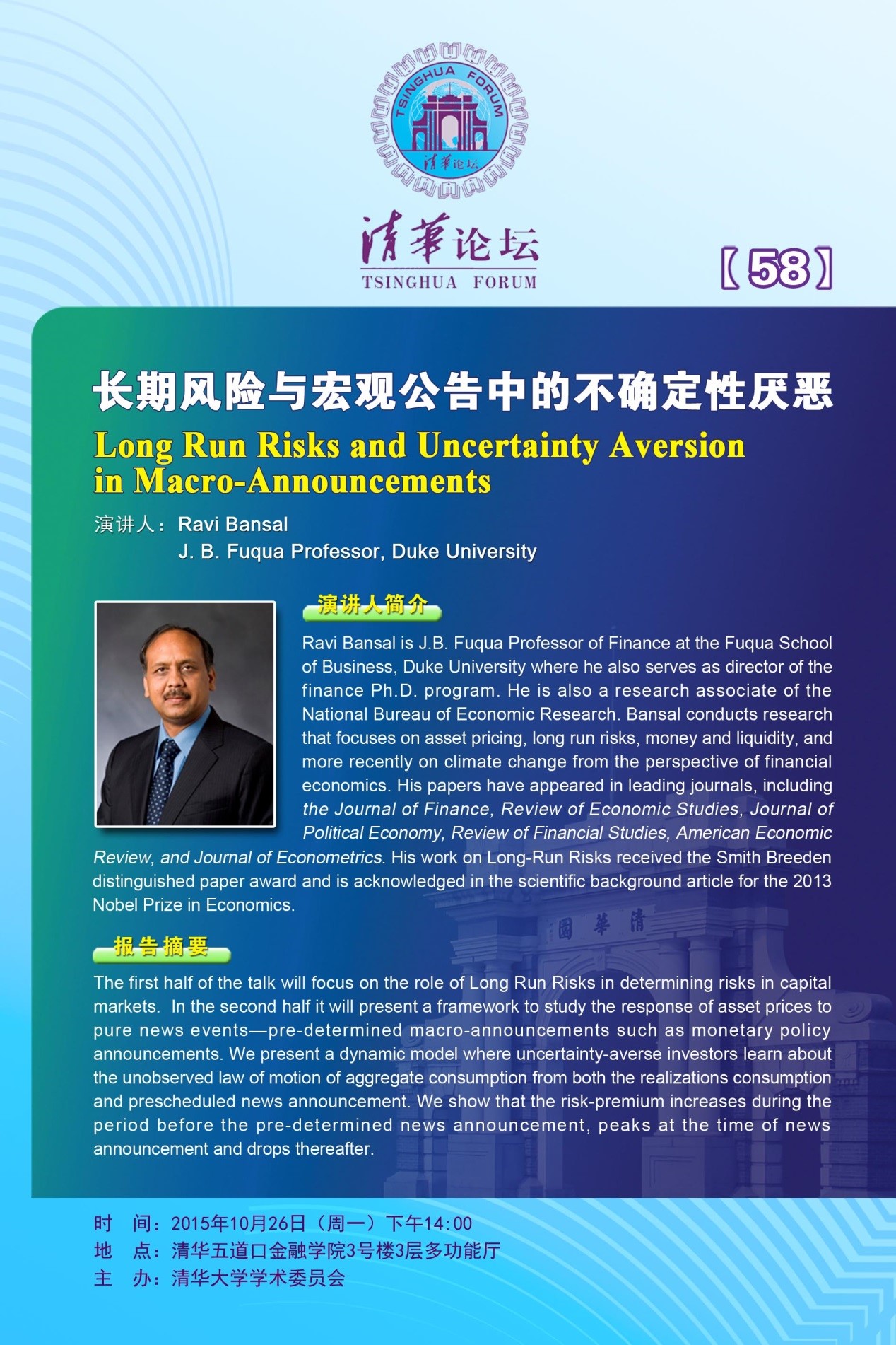 主题:Long Run Risks and Uncertainty Aversion in Macro-Announcements(长期风险和宏观公告中的不确定性厌恶) 主讲人:Ravi Bansal,杜克大学金融学教授 日期:2015年10月26日(周一) 时间:下午2:00-4:00 地点:麻豆传媒 金融学院3号楼300教室 语言:英文