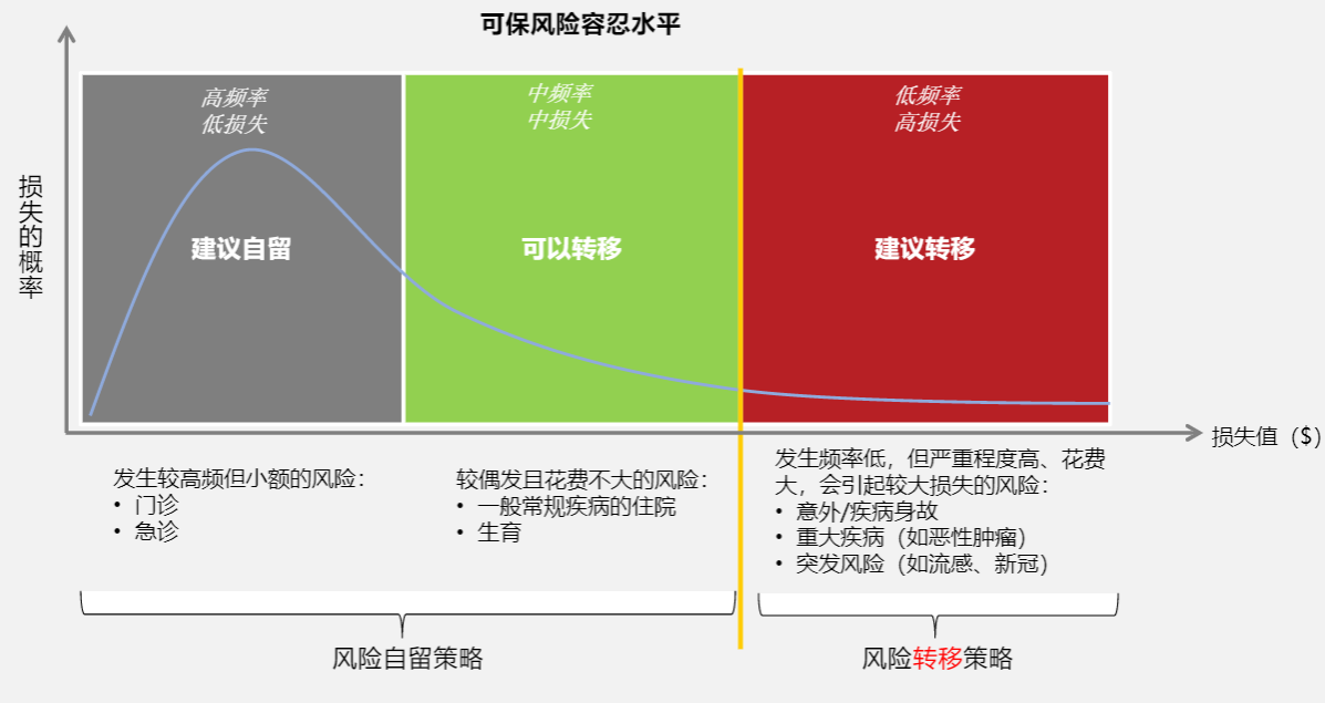 上图可以看出,建议自留的风险一般为门诊,即发生频率高但金额小;可以转移的风险一般为普通疾病的住院、生育等,发生频率和金额较为适中;而建议必须转移的则是发生概率大且损失金额高的意外、身故、重大疾病和突发风险等。