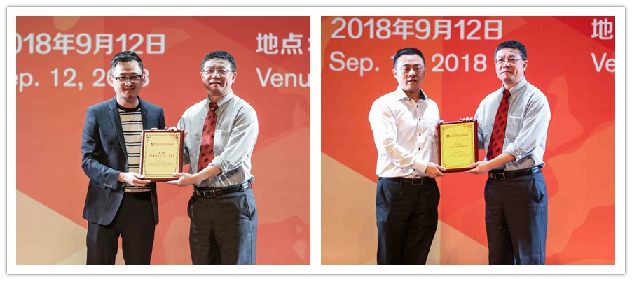 廖理为两位个人捐赠者授牌(左:蒋立章,右:刘展)