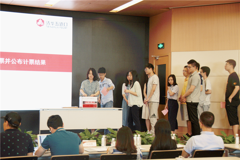 研会选举议程随后展开。校研究生会副主席王凯峰代表校研会致辞,他指出五道口金融学院研究生会在过去的一年中团结一致、积极作为,做出了扎实有效的工作。学院第六届研会主席高尚进行研会工作报告并全票通过审议,工作报告从学术科研、文体活动、学院生活等多方面全面总结了过去一年来研会所取得的成绩,并为研会下一阶段的工作开展提出了有益建议。随后,两位研会主席候选人杨千帆、董沃铭进行现场竞职演说,阐述自己的参选理由与未来工作计划。通过无记名投票,杨千帆当选为新一届研究生会主席。
