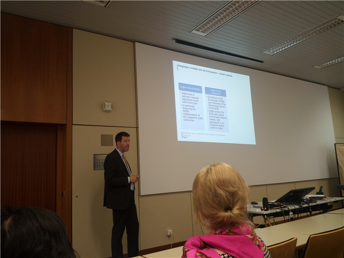 Schollmeyer 教授分享了以“德国联邦央行在欧洲央行系统中的作用”为题的讲座。他认为德国央行的重要职能之一就是“稳定物价”,并阐述了联邦银行如何在欧洲央行的统一协调下发挥其职能,简要介绍欧元区货币政策的主要目标、调控手段和决策过程。