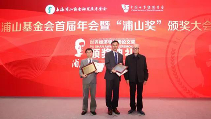 图为浦山基金会名誉理事长、中国社会科学院原常务副院长王洛林为获奖代表鞠建东和施康颁奖