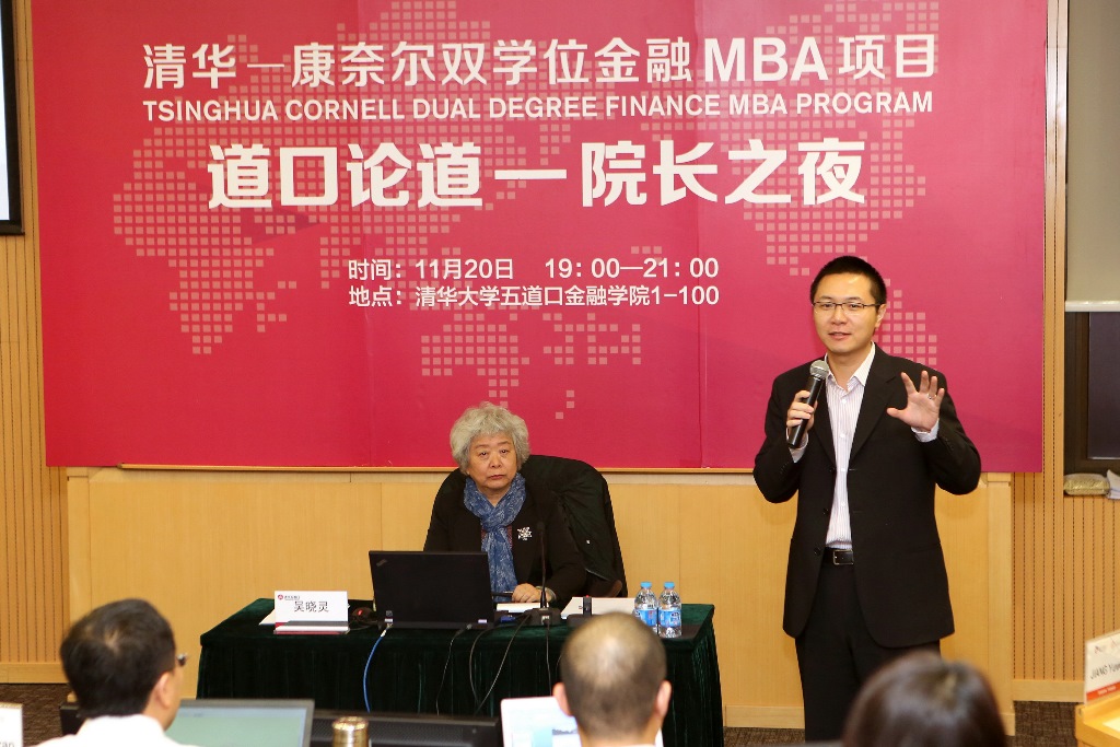 金融学院院长助理兼MBA教育中心主任田轩教授发表致辞,热烈欢迎吴晓灵院长前来参加清华-康奈尔双学位金融MBA举办的“院长之夜”活动,也介绍了学院领导对本项目的高度重视和关怀。