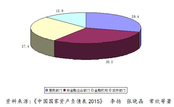 这是我们2013年国家总资产的构成,居民部门占29.4%,非金融企业部门占30.3%,金融机构占27.4%,政府部门站12.9%;