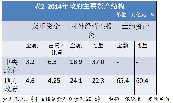 这是我们国家2014年政府资产结构,从中可以看到中央政府货币资金比例占到6.3%,对外经营性投资比重占37%,而地方政府货币资金占到4.25%,对外经营性投资占到22.3%。地方政府最大的资产是土地资产占到60.4%。