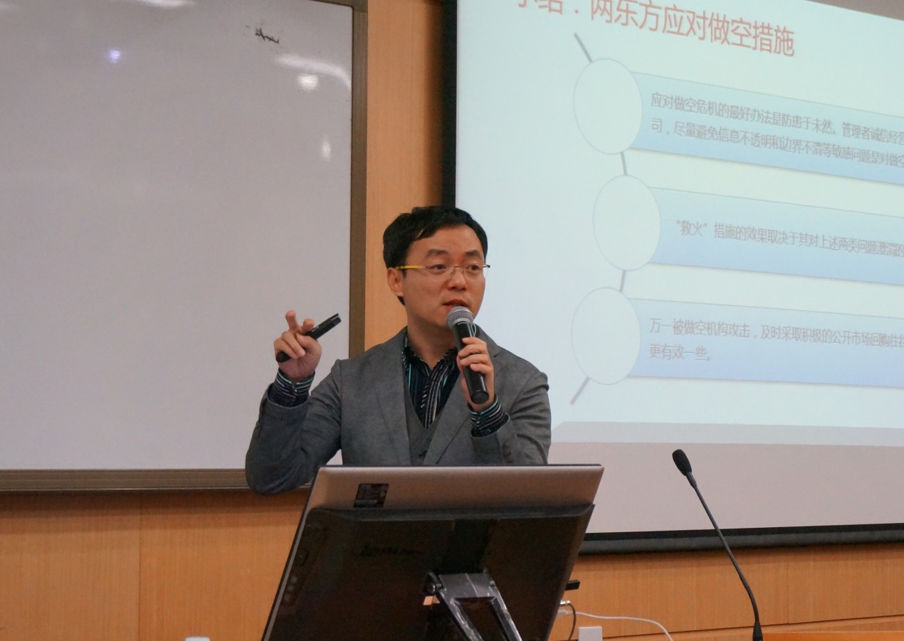 金融学讲席副教授、中国金融案例中心主任张弘分享了题为《两个“东方”做空记》的案例。张弘教授介绍,这个案例的立项源于中国金融案例中心与金融监管机构的交流。通过对浑水做空新东方和东方纸业的分析,该案例旨为国内企业参与国际资本市场提供借鉴。