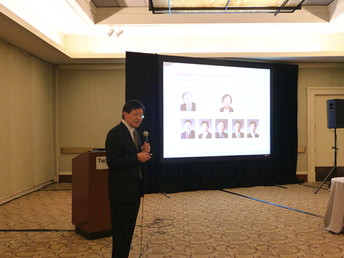 图为曹泉伟在招待酒会上推介学院