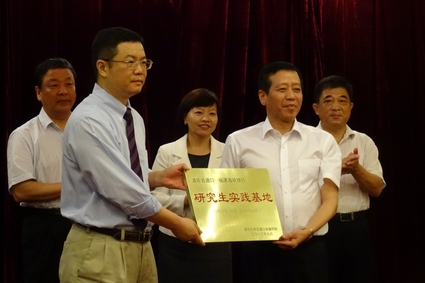 图为廖理(左)向郭运濂(右)授予就业实践基地牌匾