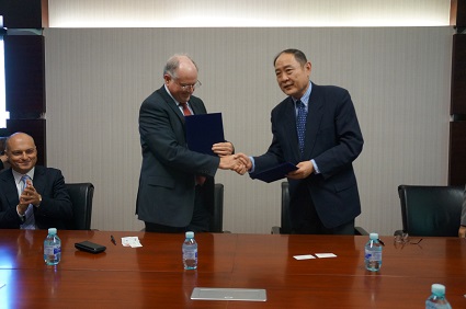 图为麦考瑞大学副校长Jim Piper与康以同副院长签署协议