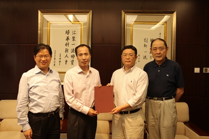 图为学院领导与王兆星合影(从左至右:聂风华、王兆星、廖理、康以同)