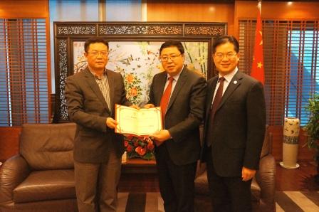 图为学院领导为黄红元校友(中)颁发战略咨询委员会委员的聘书