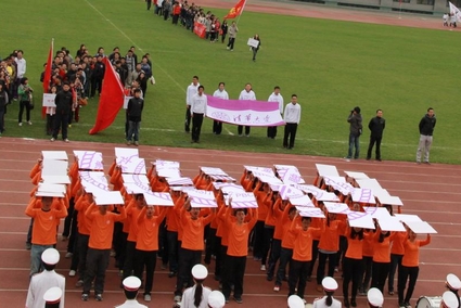 开幕式在激昂的运动员进行曲中进行,金融学院的同学们身着橘黄色服装,精神抖擞、步伐整齐,在主席台前用展板分别展示出象征五道口的“WDK”和院徽,并豪迈地喊出了“道口健儿坚如铁,清华迈步从头越”的口号,第一次在研运会赛场向全校师生展现了道口的风采。