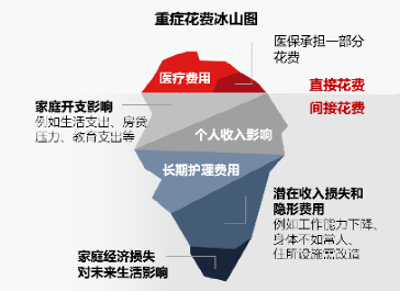 调研结果显示,很多人对重疾风险的认知不足。医疗费用等直接花费,仅是重疾治疗花费浮在水面上的冰山一角。藏在冰山下,还有更多“间接花费”,包括: