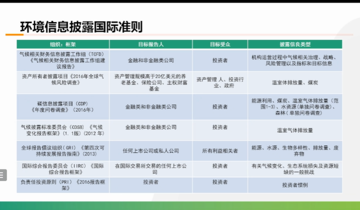 殷红表示,通过汇总整理发现,目前国际上可参照的环境信息披露相关国际准则较多,不同准则的出发点、目标受众、披露框架也有所差别。现有环境信息披露国际准则梳理如下表: