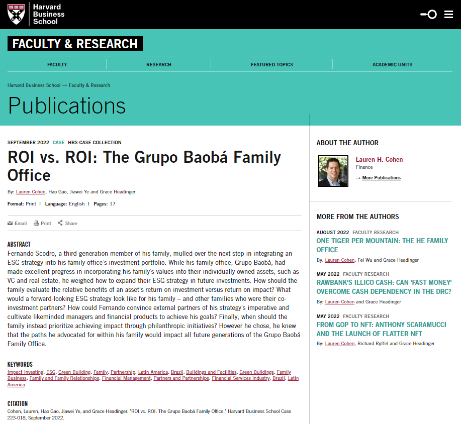 全球家族企业研究中心主任、绿色金融研究中心副主任高皓与哈佛商学院L.E. Simmons讲席教授劳伦·科恩(Lauren Cohen),哈佛商学院研究员格蕾丝·海丁格(Grace Headinger)及世界经济论坛慈善基金会与募资负责人叶嘉伟合著的案例《财务投资回报率vs影响力投资回报率:Grupo Baobá家族办公室》(ROI vs. ROI: The Grupo Baobá Family Office)被哈佛商学院案例库收录(收录号:Harvard Business School Case 223-018)。
