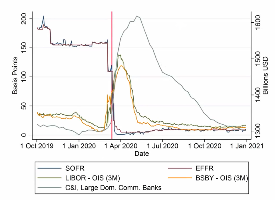 达雷尔·达菲在他最新的研究中发现,在2008年大金融危机时期(The Great Financial Crisis)银行的工商贷款(Commercial and Industrial Lending,简称“C&I”)增长7%,在2020年新冠疫情时期增加了20%,近3000亿美元。事实表明,在信用利差较高的危机时期,许多企业将会集中要求银行兑现之前的贷款承诺,这将导致银行流动性的挤兑现象。银行为了满足贷款承诺,需要去市场融入相应的资金缺口,以贷给工商企业。而由于此时风险加剧,出借资金给银行的人会要求更高的利率以对高风险进行补偿,而贷款承诺的参考利率却是无风险利率,这将刺激企业更加激进地贷款,这将导致银行的借款成本上升,出现对银行非常不利的情况。为了应对突发的风险,银行必须更加合理有效地制定贷款额度计划。达雷尔·达菲列举了包括SOFR、LIBOR、EFFR等一系列基准利率和贷款总量在疫情前后的变化,来论证此问题。最后发现,这些利率都没能反映出银行需要的风险补偿。