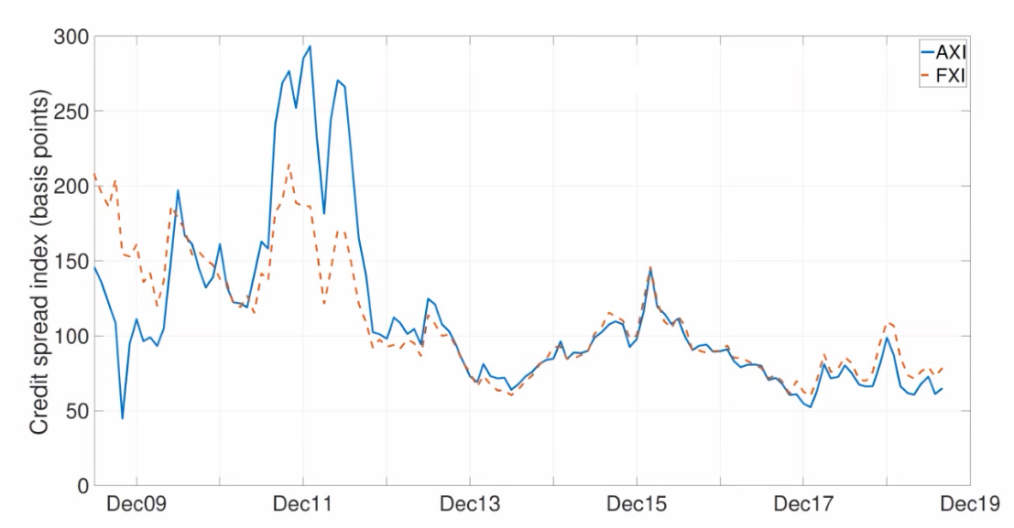 达雷尔·达菲还介绍了AXI指数在美国的情况,并用2011年起的长期AXI与指数FXI(Financial Conditions Credit Spread Index,简称“FXI”)的长期部分做对比。两者的不同点在于,AXI只计算了银行发行债的信用利差,FXI计算了所有公众公司发行债的信用利差。达雷尔·达菲表示,对比AXI与FXI的长期部分可以发现,2011-2012年两个指数前期相似性较差是由于受到当时金融银行危机的的影响,但从2013年开始两者走势非常一致,所以AXI指数与FXI指数可以互相做为对方的近似估计。