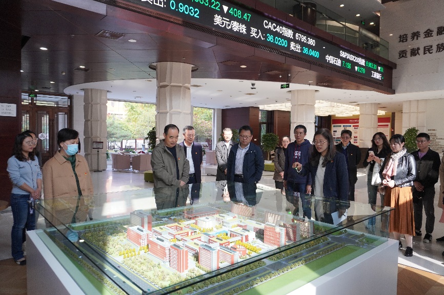 共建双方的支部成员们首先在金融学院一楼大厅集合,在金融学院教职工第二党支部书记侯爽的讲解下,参观通州金融发展与人才培养基地沙盘,并就项目的建设情况展开交流。