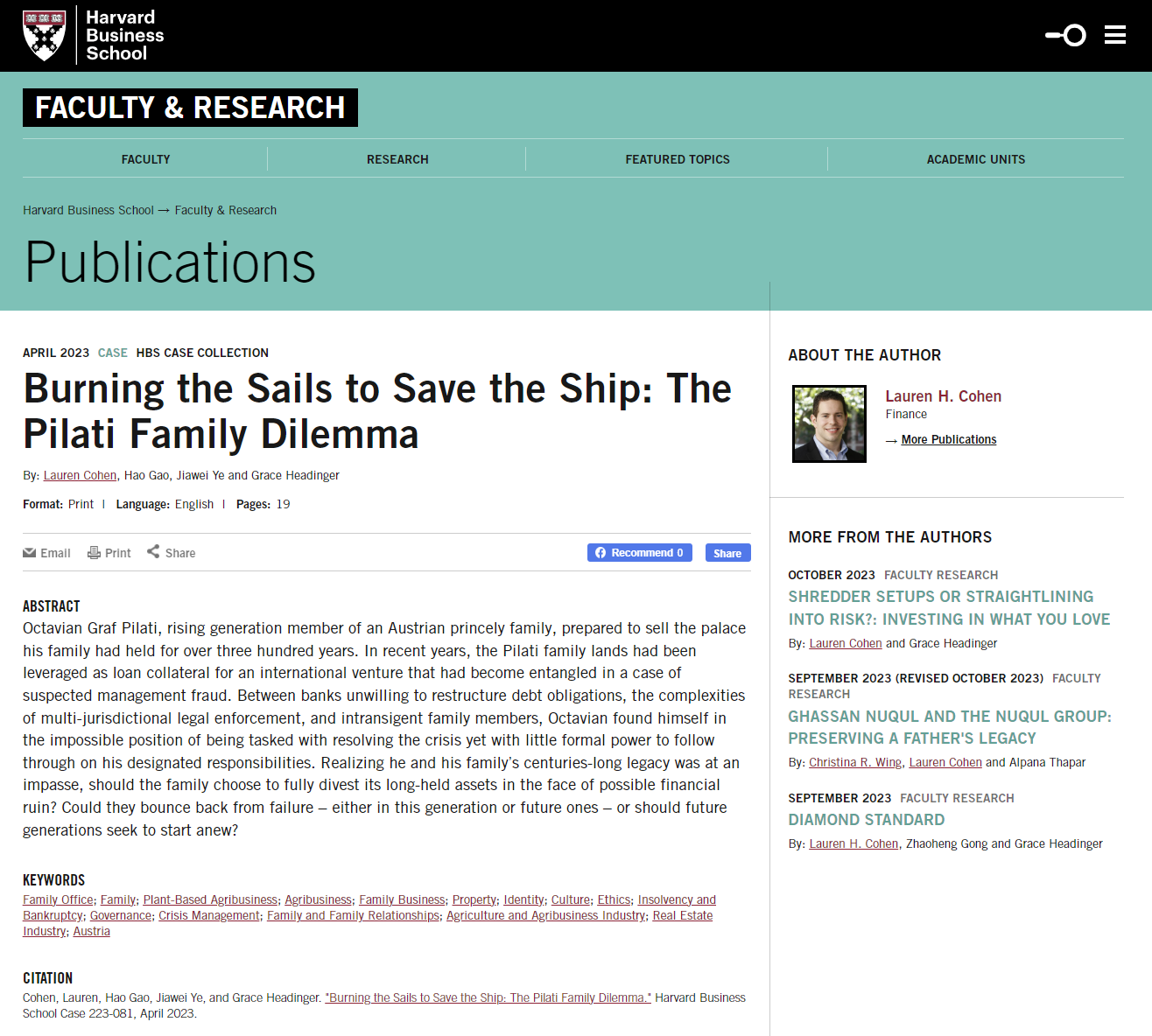 全球家族企业研究中心主任、绿色金融研究中心副主任高皓与哈佛商学院讲席教授劳伦·科恩(Lauren Cohen)、时任世界经济论坛慈善基金会与募资负责人叶嘉伟、哈佛商学院案例研究员格蕾丝·海丁格(Grace Headinger)合著的案例《烧帆救船:皮拉蒂家族的两难选择》(Burning the Sails to Save the Ship: The Pilati Family Dilemma)被哈佛商学院案例库收录(收录号:HBS Case 223-081)。