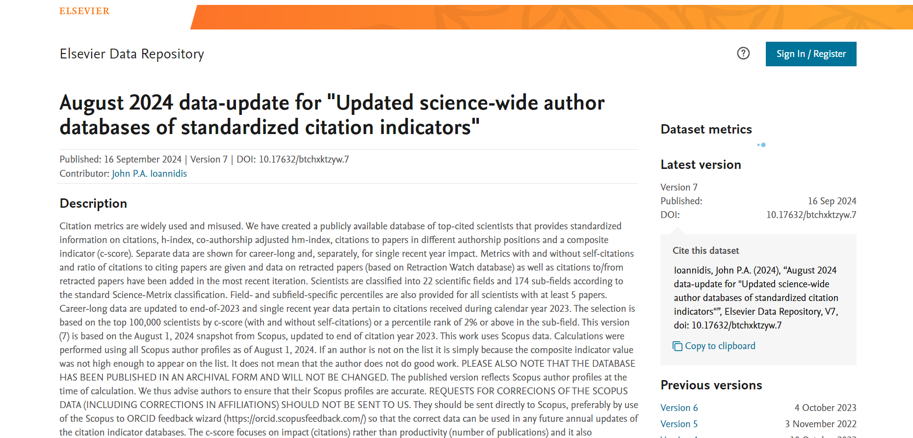 2024年度全球前2%顶尖科学家榜单(World's Top 2% Scientists 2024)由斯坦福大学的John P.A. Ioannidis教授团队依据Scopus数据库推出,采用多项标准化指标,包括总引用量、h-指数、修正的hm-指数及综合指标(c-score),以更全面地评估科学家的学术表现。为考虑不同研究领域的特性,该榜单将科学家划分为22个领域和174个子领域,旨在为科研人员提供客观、公正的学术影响力衡量。