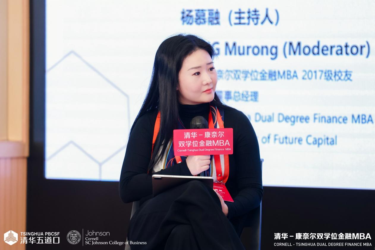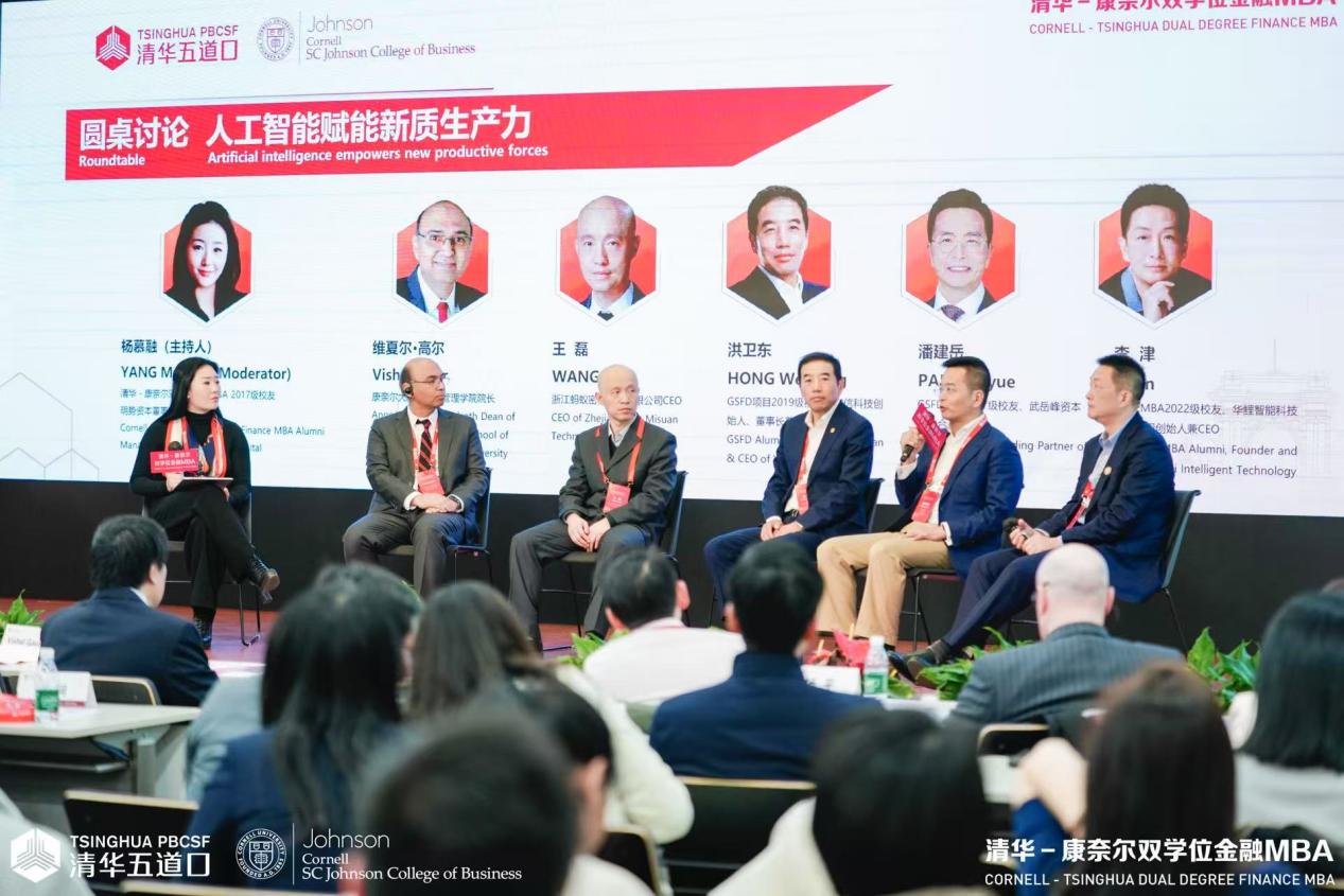 在《人工智能赋能新质生产力》圆桌讨论中,清华-康奈尔双学位金融MBA2017级校友、明势资本董事总经理杨慕融,康奈尔大学约翰逊管理学院院长维夏尔·高尔,浙江蚂蚁密算科技有限公司CEO王磊,麻豆传媒
