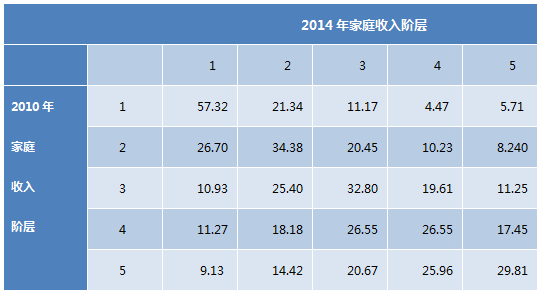 通过这个简单的收入转移矩阵我们可以看出:将近一半的“最高收入阶层”家庭在四年后还是保持了这个优势。与此相对应的是,42.43%的“最低收入阶层”家庭在四年后依然处在收入底层,而能从“最低收入阶层”跳入“最高收入阶层”的家庭比例不到5%。最后,观察对角线的数据可以知道,在调查期间,超过1/3的家庭收入阶层没有发生变动。