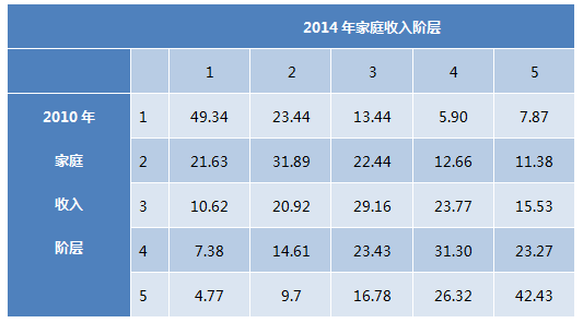 在展开讨论之前,我们首先需要弄清楚一个问题——收入阶层固化的现象在我国是否确实存在?它到底有多严重?这里我们可以借助中国家庭追踪调查在2010、2014年的两次调查数据来对这个问题做一个简单的定量分析。这个调查从2010年开始,在全国25个省/市/自治区抽取样本进行追踪调查,调查问题包含家庭的具体收入等信息,这些信息一定程度上可以帮我们刻画家庭收入的阶层变化。根据这个数据,我们可以画出样本中城市家庭在2010-2014年间的一个收入变化情况(见表1)。