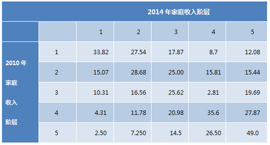 具体说来,我们将这些家庭的收入情况从高到低平分成五个层级,即收入排在前20%的家庭属于第一收入梯队,以此类推。那么,下表中的数字指的就是在2010年处于某一个收入梯队的家庭有多大比例进入到了另一个梯队,例如49.34表示2010年收入最高层级的家庭有49.34%在四年后还是处于收入第一梯队。