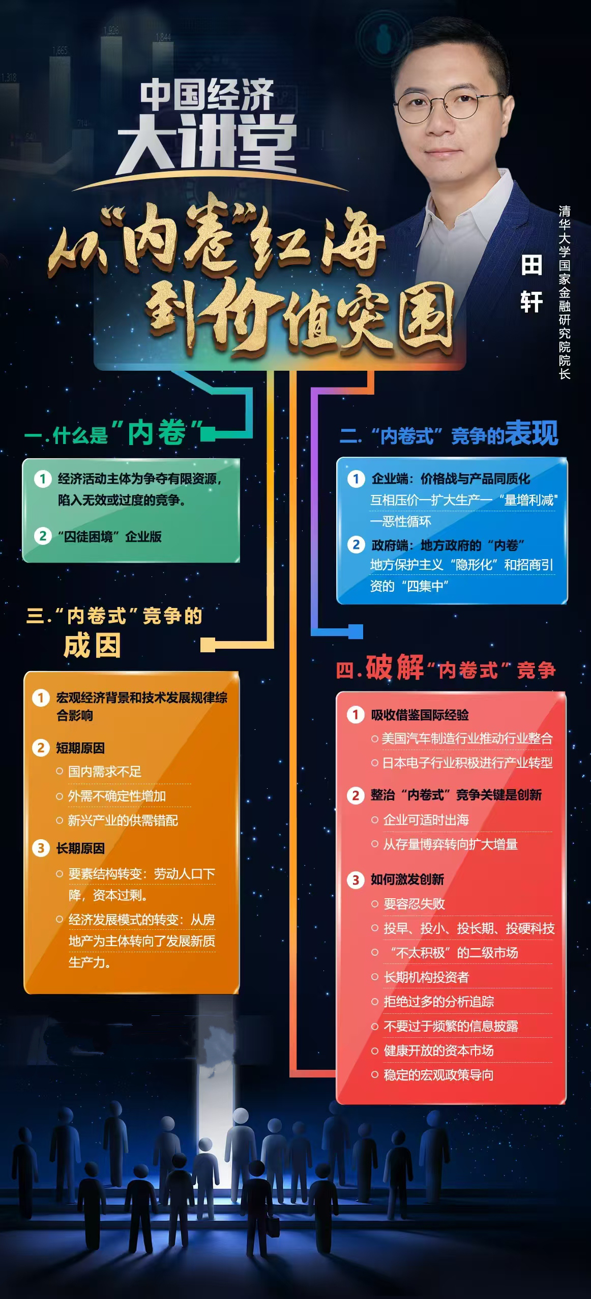 在剖析“内卷式”竞争的本质与危害后,聚焦“如何破局”,田轩提出基于国际案例借鉴与中国国情的系统性解决方案,核心在于通过科技创新与制度优化实现从存量博弈到增量竞争的转变。
