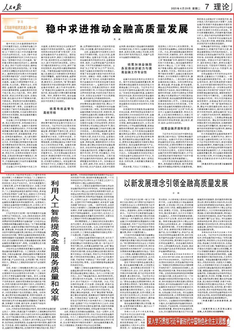 院长焦捷在《人民日报》(2025年4月29日)理论版发表署名文章,题为《稳中求进推动金融高质量发展》。现将全文转载如下,以飨读者。