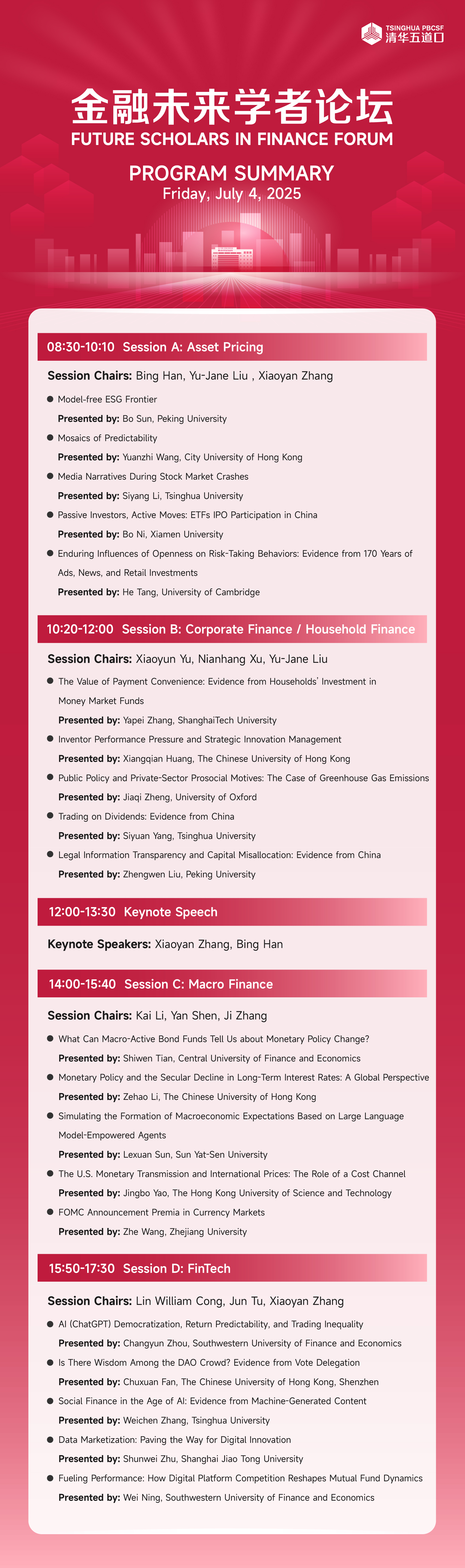 将于2025年7月4日举办首届金融未来学者论坛(Future Scholars in Finance Forum),为国内青年金融学者提供一个展示研究成果、交流学术思想的高水平学术交流平台。论坛将聚焦青年学者的成长与发展,计划邀请金融领域的资深学者分享学术成果与研究经验。