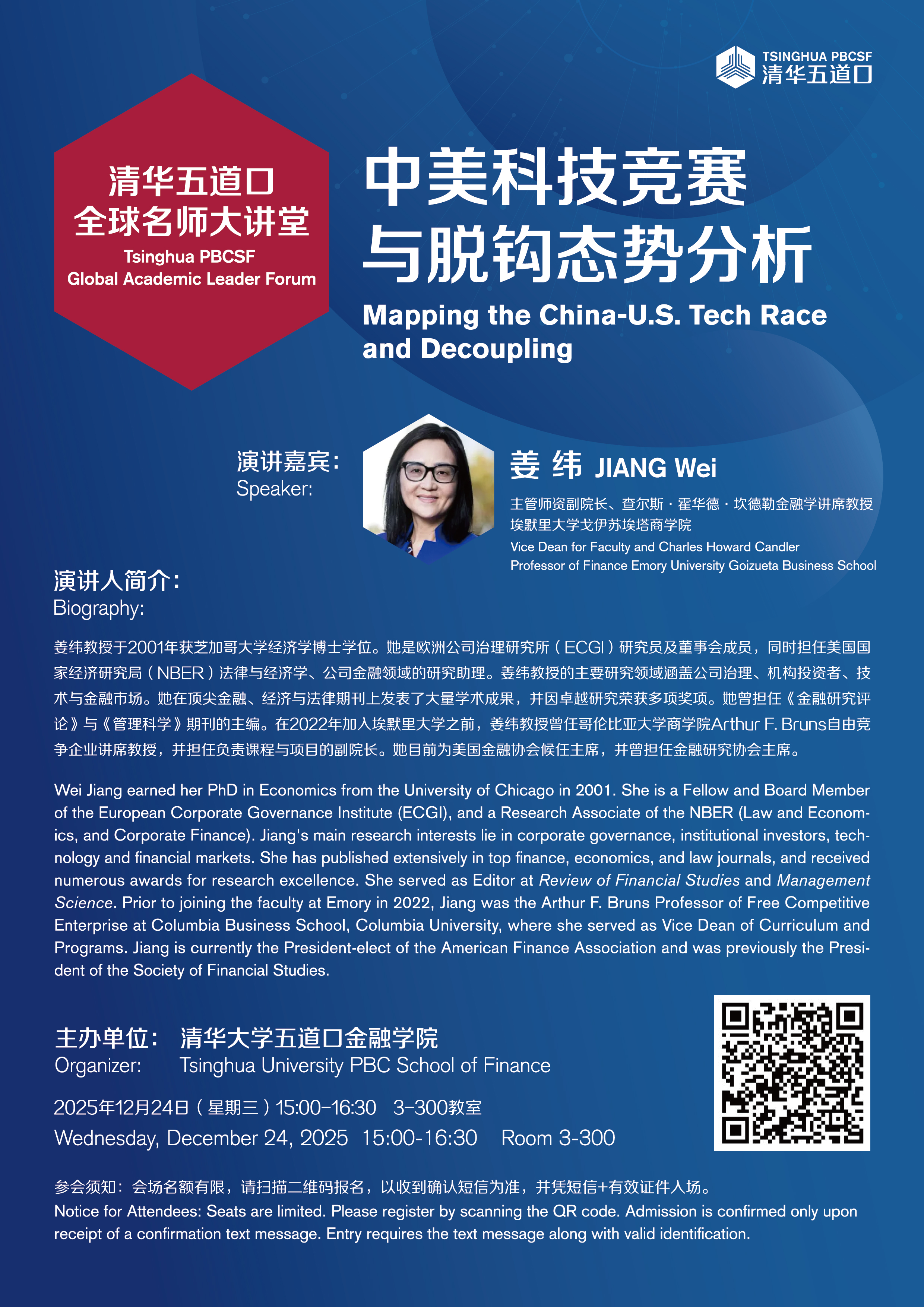 姜纬教授于2001年获芝加哥大学经济学博士学位。她是欧洲公司治理研究所(ECGI)研究员及董事会成员,同时担任美国国家经济研究局(NBER)法律与经济学、公司金融领域的研究助理。姜纬教授的主要研究领域涵盖公司治理、机构投资者、科技与金融市场。她在顶尖金融、经济与法律期刊上发表了大量学术成果,并因卓越研究荣获多项奖项。她曾担任《金融研究评论》与《管理科学》期刊的主编。在2022年加入埃默里大学之前,姜纬教授曾任哥伦比亚大学商学院Arthur F. Bruns自由竞争企业讲席教授,并担任负责课程与项目的副院长。她目前为美国金融协会候任主席,并曾担任金融研究协会主席。