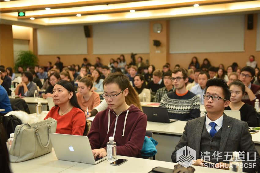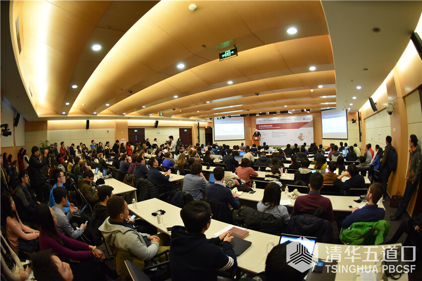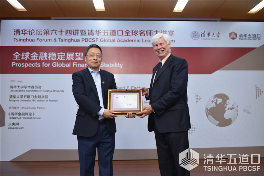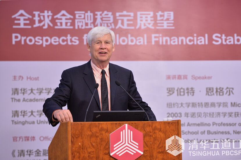 副院长、紫光金融学讲席教授周皓主持,来自海内外的近200位金融学者、研究人员与我校师生参加了会议。恩格尔教授以“全球金融稳定展望”为题,分别就中国资本市场波动性、金融机构系统性风险和全球经济金融面临的挑战及其应对等方面进行了学术报告。