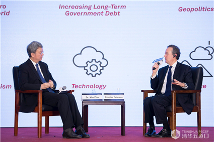 图为朱民与道格拉斯·彼得森对话