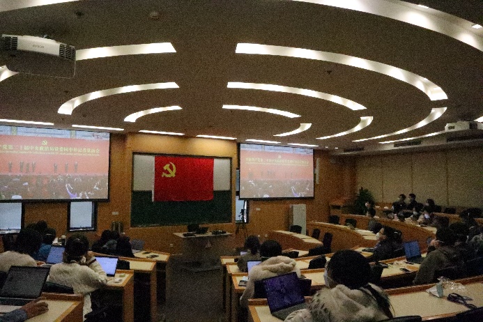 在满足疫情防控要求的前提下,学院2021级硕博党支部全体成员学院教室共同收看记者会盛况。在记者会一小时的过程中,收看现场不时响起热烈的掌声。