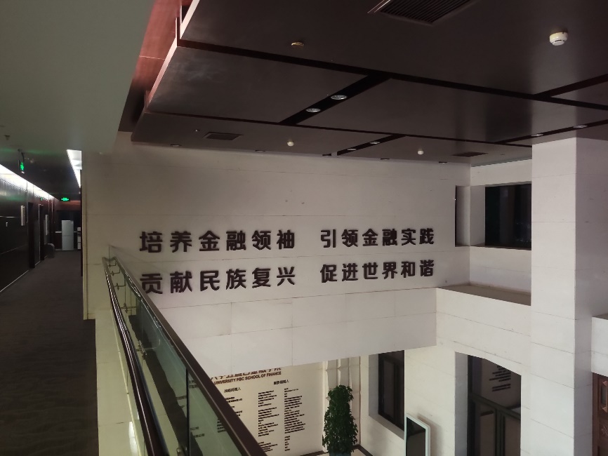 提笔之时,我正准备奔赴人生新的征程,思绪不由得又穿越到2021年9月6日的夜晚。当晚,我漫步在1号楼,倏忽间抬头,望见大厅使命墙上的几行大字:“培养金融领袖,引领金融实践,贡献民族复兴,促进世界和谐”,顿觉心中感慨万千,神思飞扬,不由拍下一张照片,至今保存着。怀着对知识的渴望和对未来的憧憬,在两年之后,在“不怕苦,敢为先,讲团结,重贡献”五道口传统的熏陶下,我将书写出怎样的故事,以无愧于瑰宝般的硕士时光,以回报母校、师长的培养?
