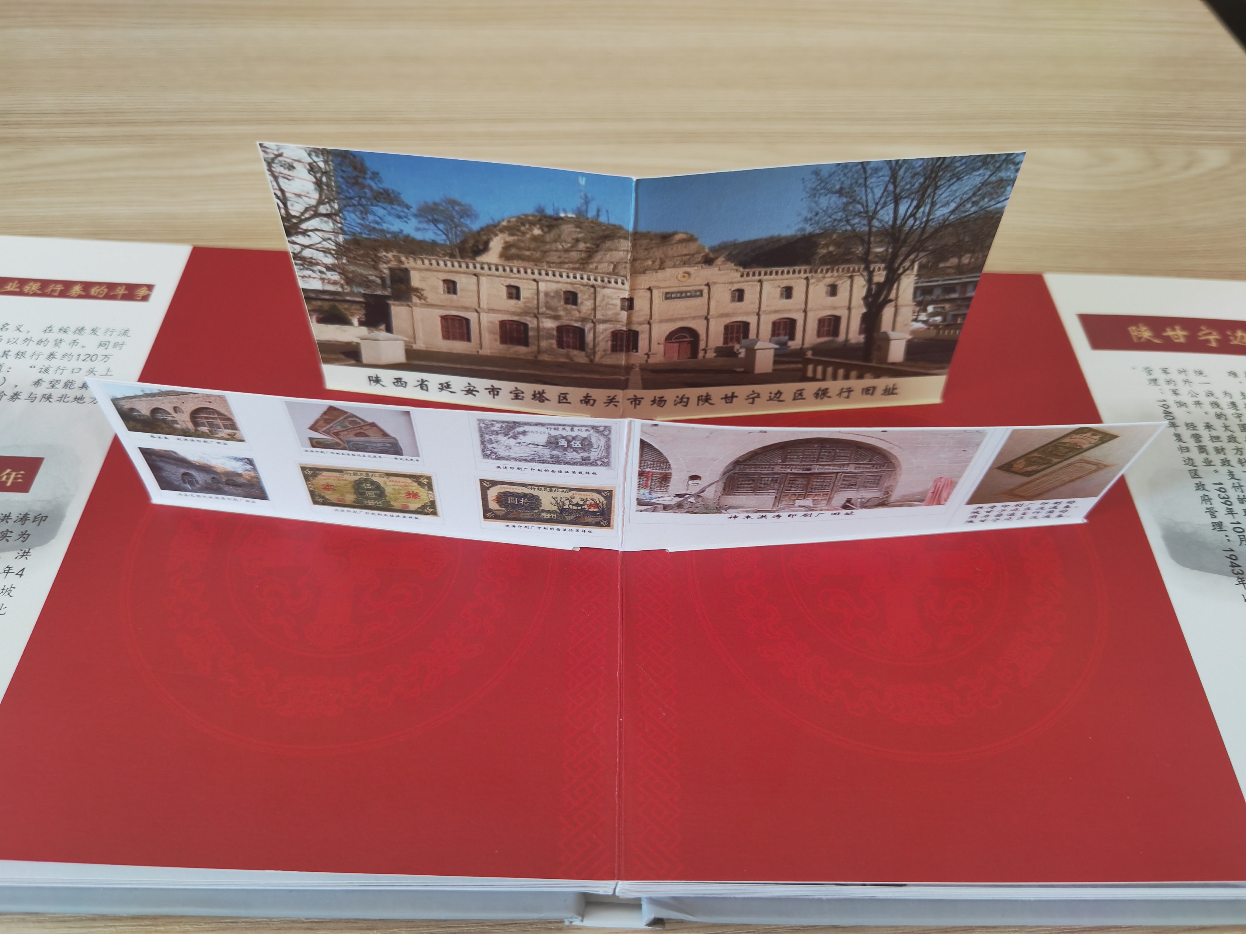 为纪念战争年代陕北榆林地区金融领域的艰苦斗争,支队制作红色金融纪念剪纸画册,整理当地红色金融历史书稿两万余字,结合陕北非遗剪纸,给佳县留下一份红色文旅产业的伴手礼。画册详细介绍了1934-1949年期间的红色金融历史,分为逆境生存、支持抗战、迎接解放3个篇章,最中间是以“东方红”为主题修建的东方阁剪纸模型,画页上展现战争年代榆林地区金融建设的艰辛历程,书写波澜壮阔的金融史诗。