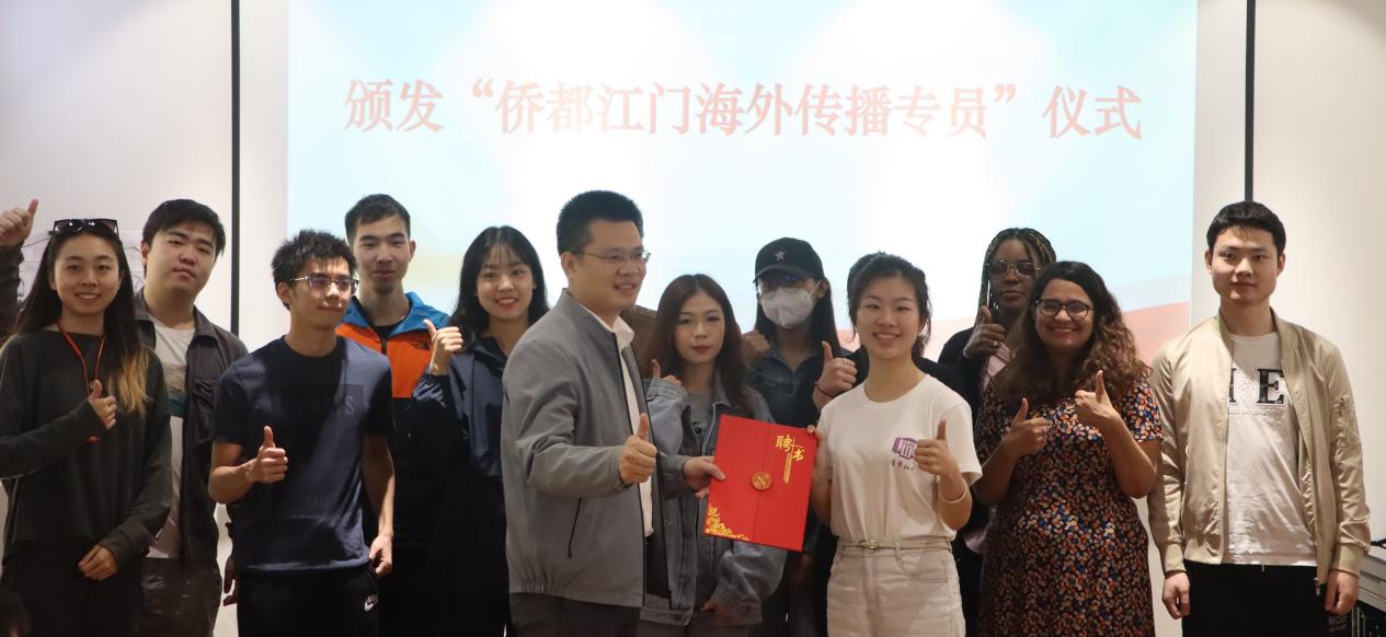 实践支队的13位成员还在江门市委宣传部的邀请下担任了“侨都江门海外传播专员”。在新会区新时代文明实践中心,支队成员在歌声中上了一堂生动的党课,并通过与校友座谈、开展“助力新会学子筑梦远航”志愿服务等方式,全面了解新会在纵深推进新时代文明实践、青年创新创业扶持等方面的经验做法。江门市委宣传部有关负责人表示,这是校地合作的新模式,也是开展国际传播的新路径。支队成员将继续深入挖掘侨乡优秀文化与故事,结合自己的专业所长向国际社会讲好中国故事。