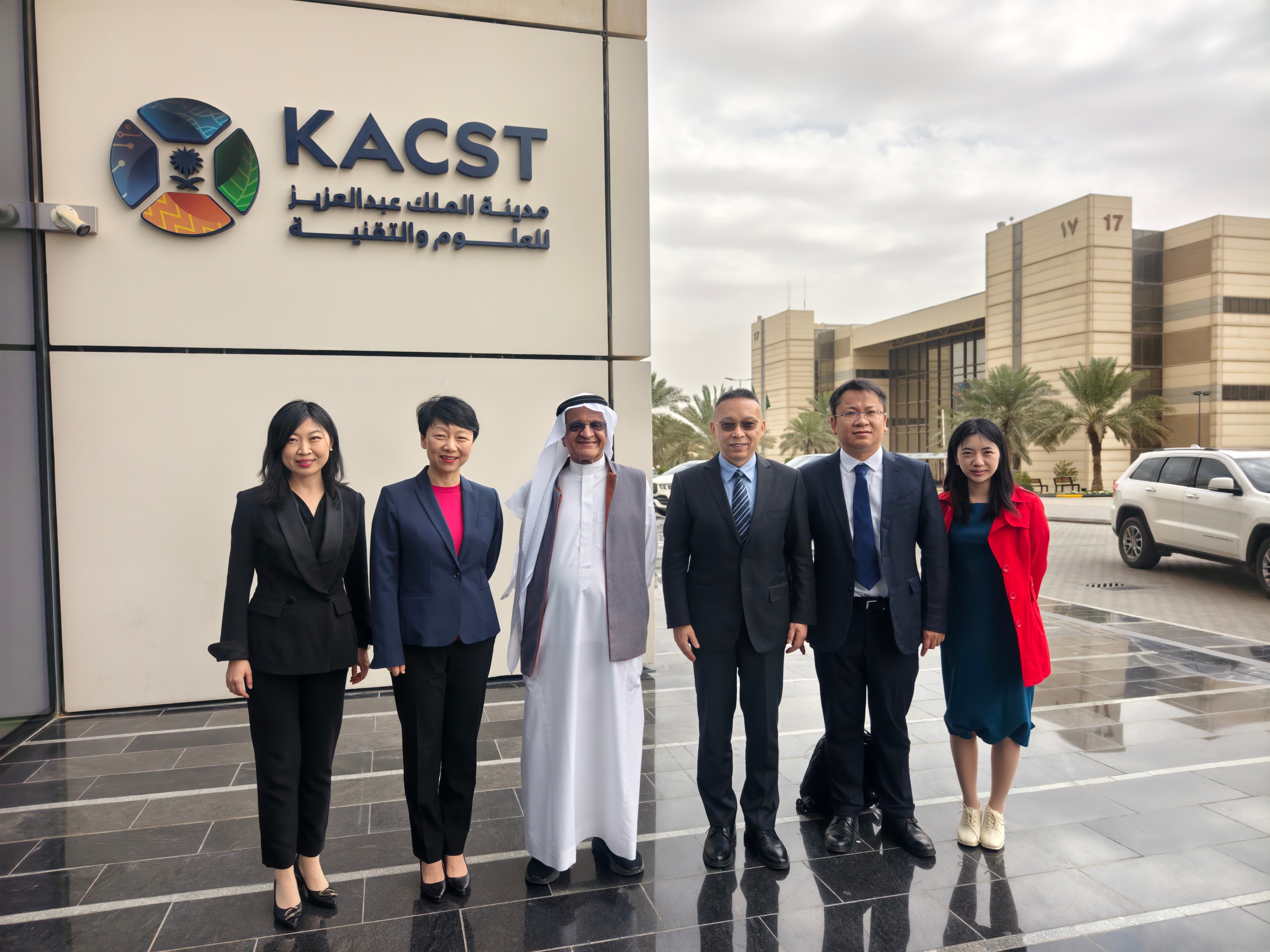 图为焦捷(右三)、张晓燕(左二)与默罕默德 苏韦 仪(Mohammed Ibrahim Al-Suwaiyel)(左三)合影