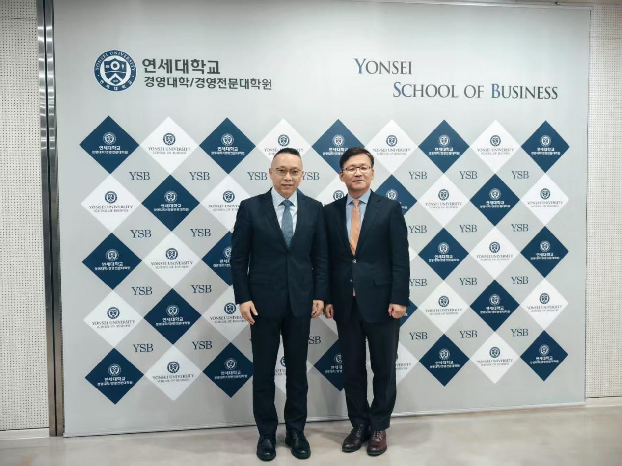 图为焦捷(左)和延世大学商学院院长许大植(Daesik Hur)(右)合影