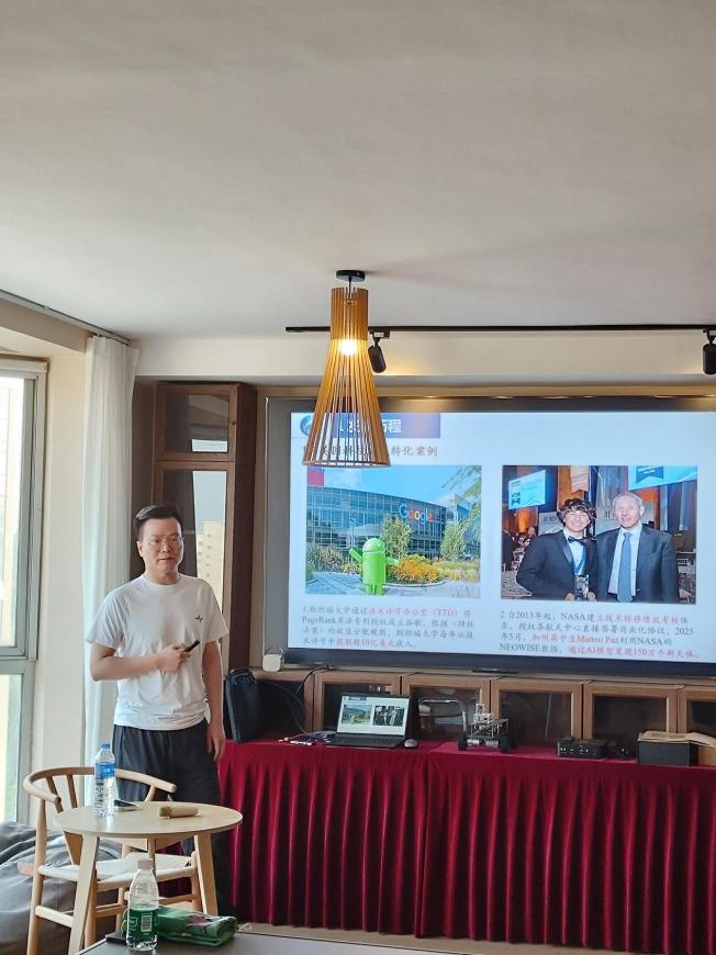 图为胡亚洲给中国科学院大学MBA同学讲解科技成果转化